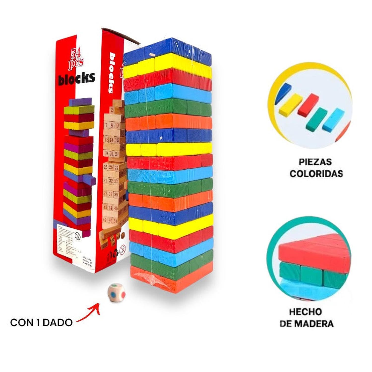 Disfruta de horas de diversión en familia con el Jenga de Madera de Colores. Este clásico juego de 54 piezas de madera es perfecto para desarrollar la destreza, concentración y habilidades de coordinación. Sus bloques de colores hacen que sea aún más entretenido, ideal para niños y adultos. Es un excelente juego educativo y recreativo, perfecto para reuniones, fiestas o simplemente para relajarse. ¡Desafía tu equilibrio y diviértete mientras apilas las piezas! Características: • 54 piezas de madera en colores vibrantes • Estimula la concentración y la coordinación • Ideal para niños y adultos • Perfecto para reuniones familiares y fiestas